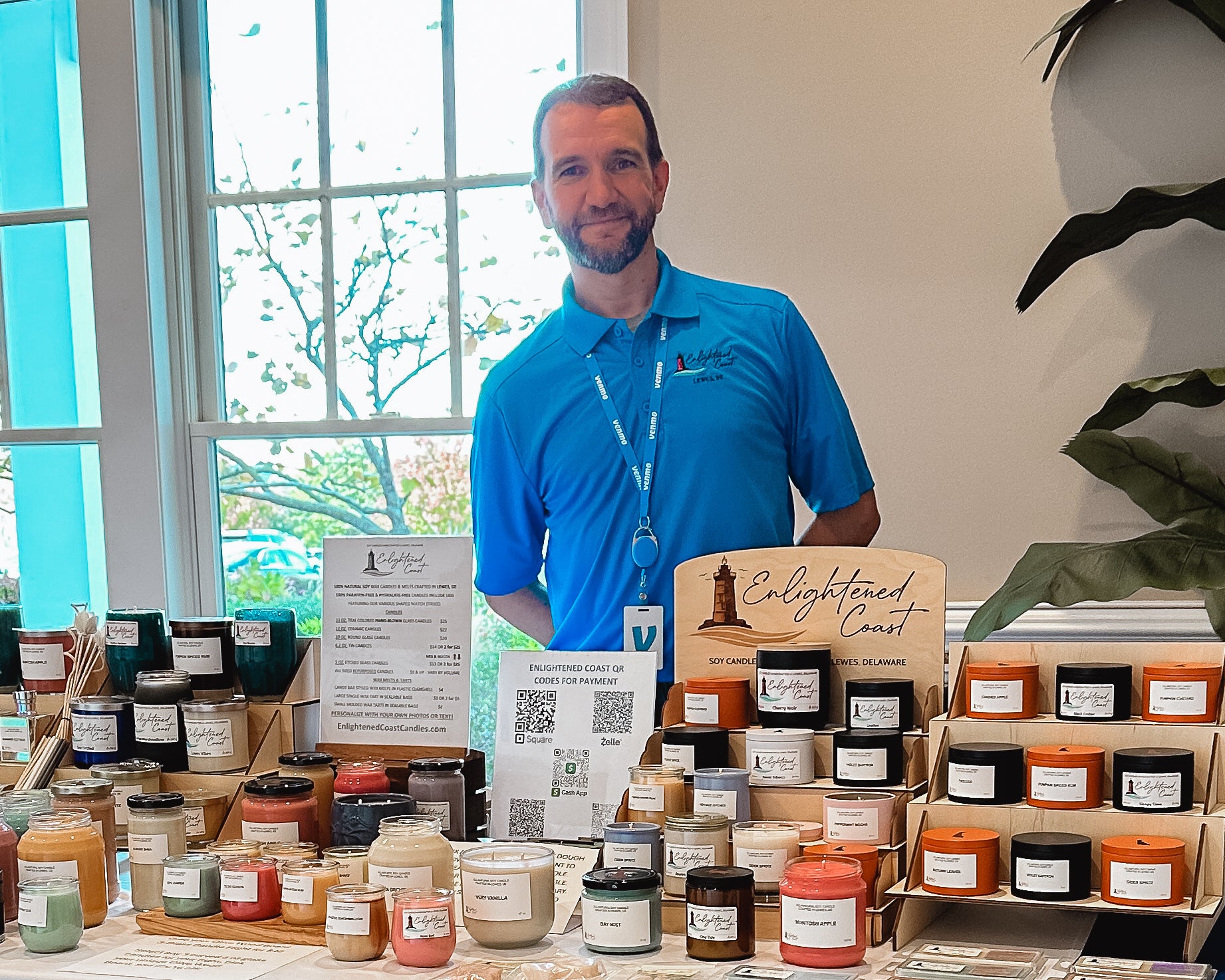 Born in Lewes, Delaware—a town of lighthouses, salt air, and coastal charm—Enlightened Coast Candles began with some bold ideas: abandon traditional candle making, trade paraffin for all-natural soy wax, and replace bland glass jars with designs that strike on purpose, literally with match-strike lids shaped like Delaware’s coastline.